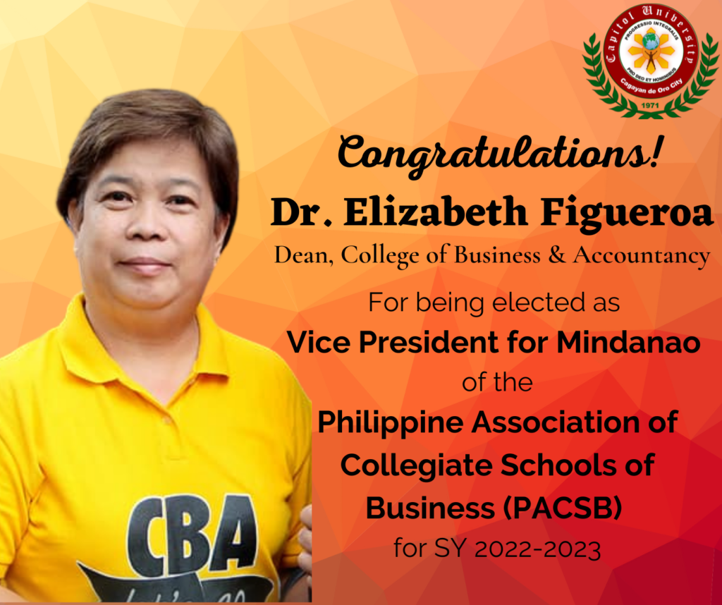 Congratulations to DR. ELIZABETH FIGUEROA, Dean of the CU College of Business & Accountancy, for being elected as VICE PRESIDENT FOR MINDANAO of the Philippine Association of Collegiate Schools of Business (PACSB) for SY 2022-2023.