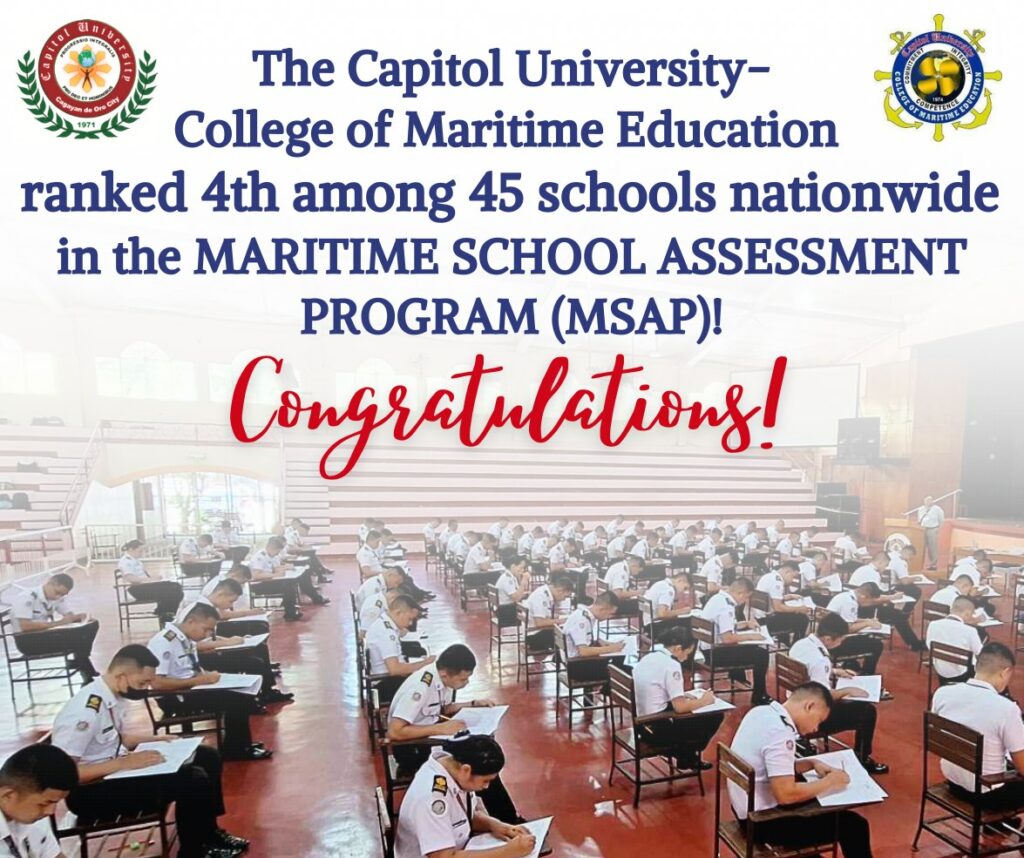 The Capitol University College of Maritime Education ranked 4th among 45 Maritime Schools nationwide that took the Maritime School Assessment Program (MSAP) national examination!