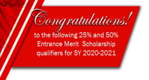 CONGRATULATIONS to the following 50% Entrance Merit Scholarship qualifiers for SY 2020-2021. Schedule and guidelines....Read more